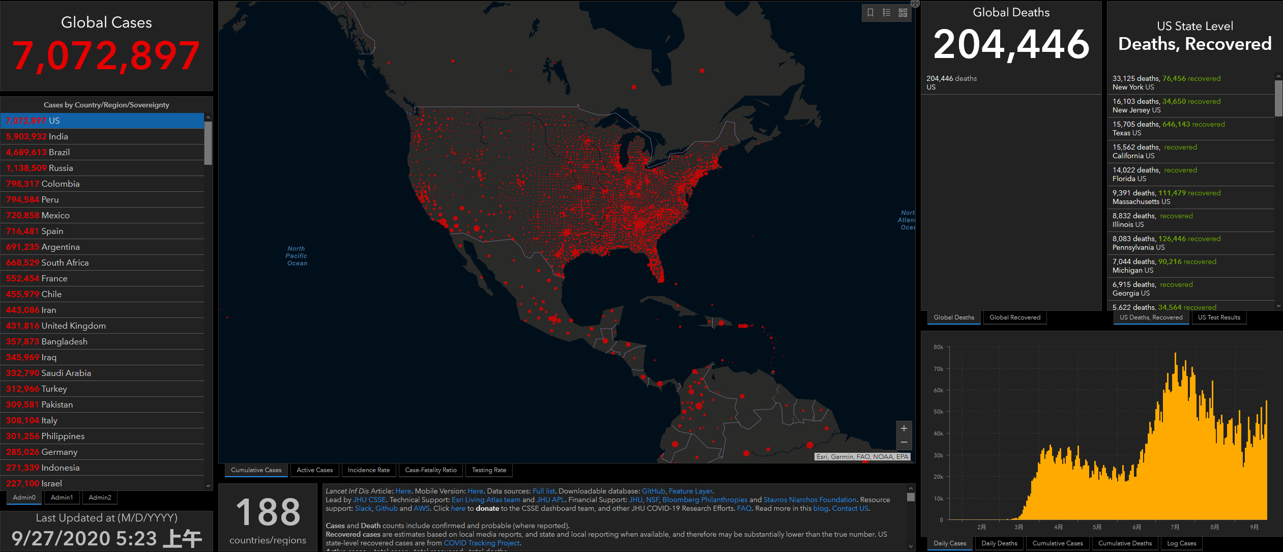 (觀察者網訊)根據美國約翰斯·霍普金斯大學實時數據,截至北京時間9月27日5時23分(美東時間9月26日17時23分),美國累計新冠確診病例達到7072897例,累計死亡達204446例,過去23小時,新增確診病例45549例,新增死亡病例897例。