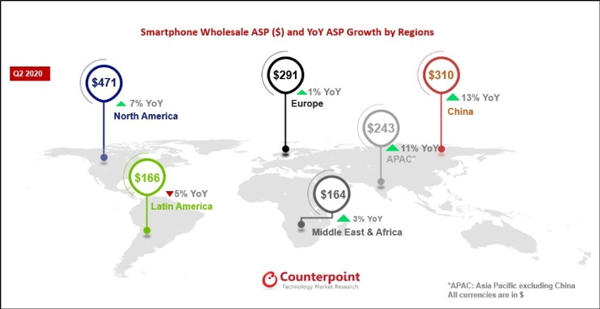 從報告來看,中國市場的手機漲幅最高,達到了13%,銷售均價為310美元(約合人民幣2114元)。北美地區雖然漲幅只有7%,但銷售均價來到了471美元(約合人民幣3213元)。