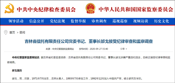 據吉林省紀委監委消息:吉林省信託有限責任公司黨委書記、董事長邰戈涉嫌嚴重違紀違法,目前正接受紀律審查和監察調查。