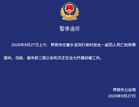 安徽界首發生4人死亡刑案,省市縣三級公安正全力偵破 None 2020-09-27 9月27日,安徽省界首市公安局官方微信公眾號“平安界首”發佈警情通報: 2020年9月27日上午,界首市任寨鄉嶽劉行政村發生一起四人死亡的刑事案件。目前,省市縣三級公安機關正在全力開展偵破工作。