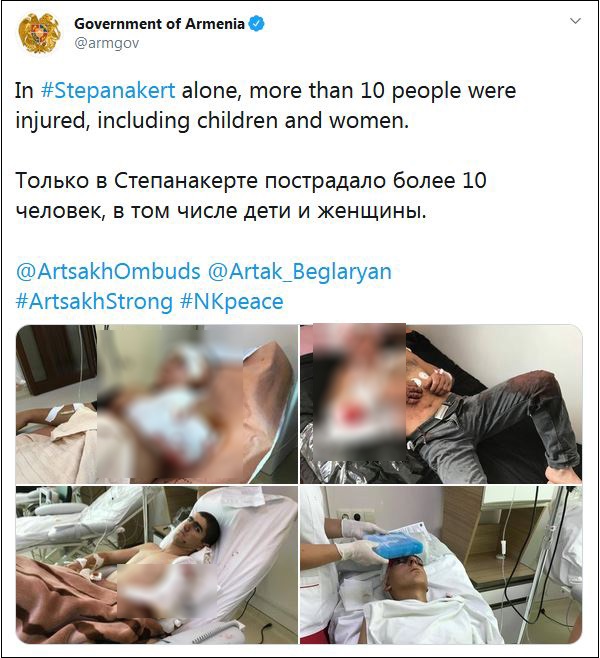 亞美尼亞政府的官方推特還發布了數張納卡地區首府斯捷潘納克特(Stepanakert)受傷平民的照片,稱僅在該地就有超過10人受傷,其中還有婦女和兒童。