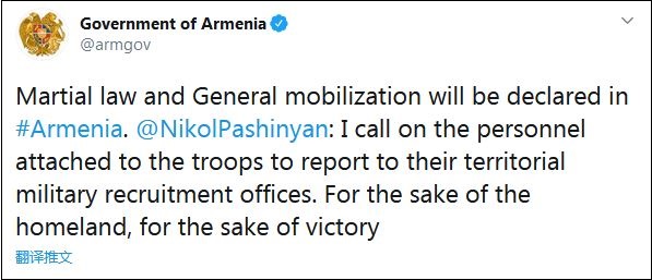 同一天,亞美尼亞政府的官方推特表示,將在全國實施戒嚴令和總動員。推特還援引總理尼科爾•帕希尼揚(Nikol Pashinyan)稱,“我請部隊所屬人員向其地方徵兵辦公室報名。為了祖國,為了勝利。”