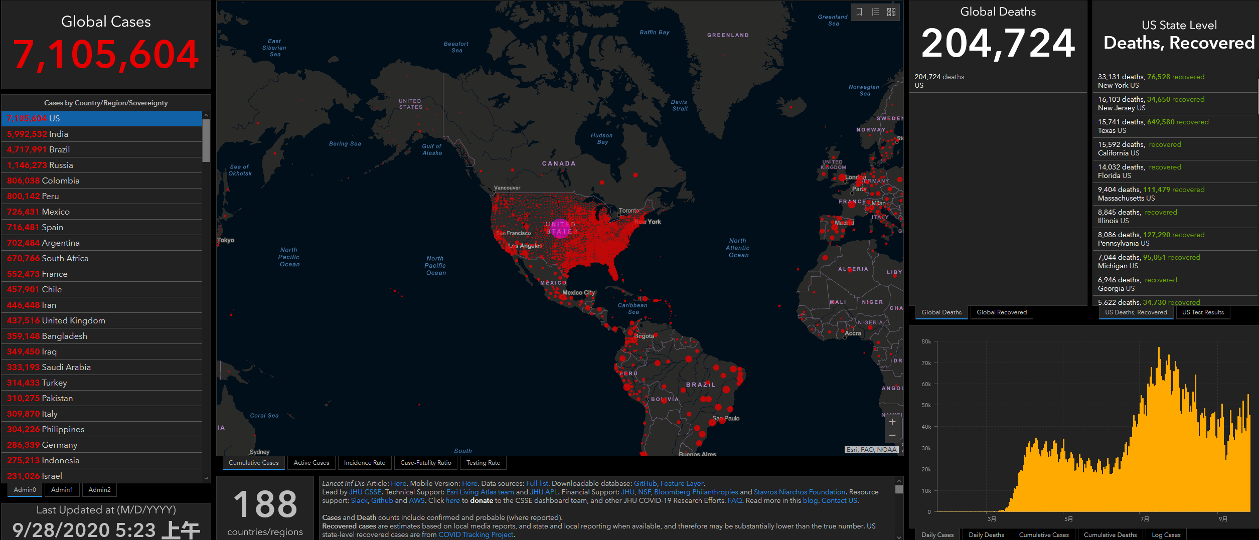 (觀察者網訊)根據美國約翰斯·霍普金斯大學實時數據,截至北京時間9月28日5時23分(美東時間9月27日17時23分),美國累計新冠確診病例達到7105604例,累計死亡達204724例,過去24小時,新增確診病例32707例,新增死亡病例278例。