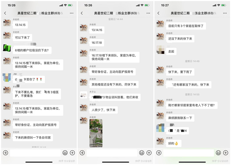 **井老師:**對,因為大家還都是比較配合的,雖然也有恐慌,比如一開始有些業主不明白情況,會傳一些謠言。還有一些業主當天晚上抱着被子、帶個小孩、揹着包要出去,我們也是反覆溝通,勸説他們先回去。但在組織核酸檢測的時候,大家還是比較積極的。