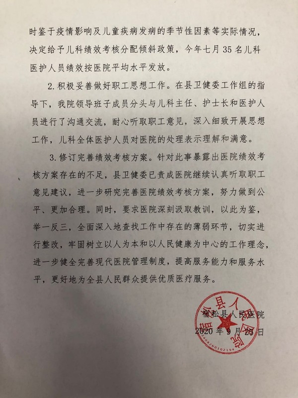 兩次“説明”均強調該院高度關心醫護人員,一直努力做好醫護人員的思想政治工作。兩次“説明”的不同點,則是發佈時間早一些的説明指出,醫院本着對醫護人員的關愛,採取了對兒科有側重傾向的轉移支付措施,把該院兒科35位醫護人員7月的績效提高到1500元,“全科醫護人員表示理解和接受”。晚一些時期發佈的“説明”,“提高到1500元”的表述不翼而飛,醫院強調兒科醫護人員的績效獎金“按照醫院的平均水平發放”。