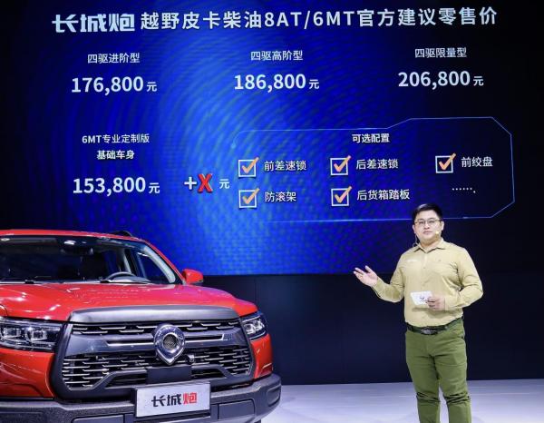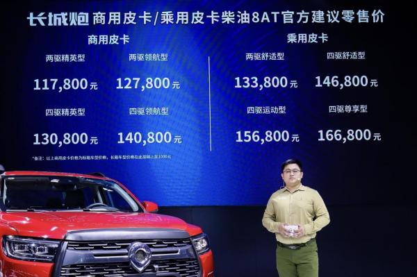 此次活動公佈了長城炮柴油8AT三款車型的市場售價。其中,長城炮商用皮卡柴油8AT售價區間為11.78萬-14.08萬元;乘用皮卡柴油8AT售價區間為13.38萬-16.68萬元;越野皮卡柴油8AT售價區間為17.68萬-20.68萬元。此外,為滿足專業越野車手及改裝愛好者需求,長城炮越野皮卡還推出了一款柴油6MT“專業定製版+X”車型,售價15.38萬元起,並提供前/後差速鎖、絞盤等選配配置。