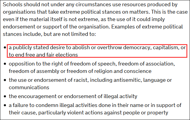 更為嚴格的是,學校不僅不能教授“反資本主義”等內容,即便有些內容本身符合規定,但只要該內容出自於持有“極端政治立場”的組織,英國教育部認為也不應當使用。
