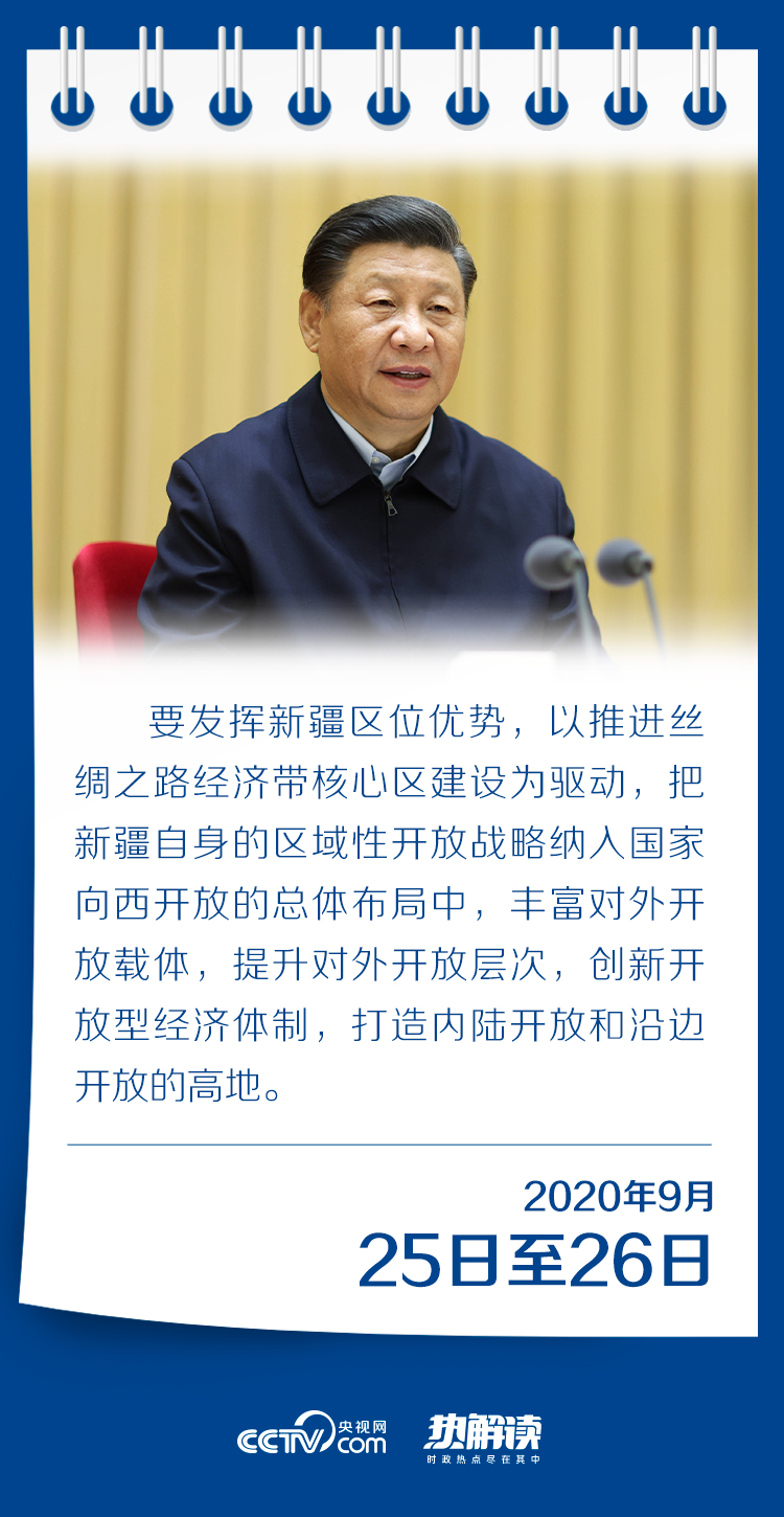 總書記説,要發揮新疆區位優勢,以推進絲綢之路經濟帶核心區建設為驅動,把新疆自身的區域性開放戰略納入國家向西開放的總體佈局中,豐富對外開放載體,提升對外開放層次,創新開放型經濟體制,打造內陸開放和沿邊開放的高地。