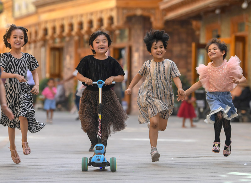 孩子們在新疆和田市鴿子巷奔跑玩耍(2020年5月27日攝)。