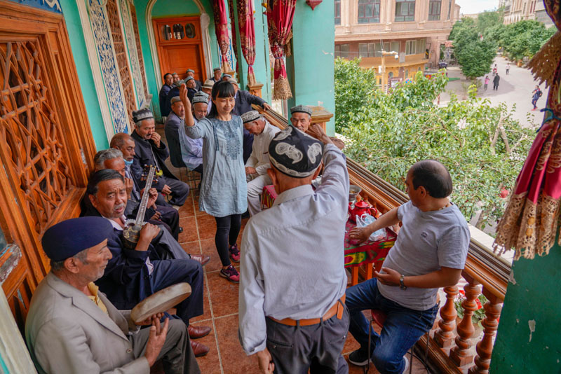 在新疆喀什古城景區的“百年茶館”,遊客和當地茶客邊品茶邊休閒(2020年5月17日攝)。