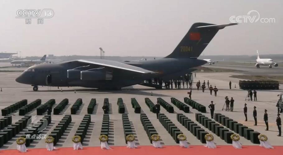 27日11點18分, 載有117位在韓志願軍烈士遺骸的中國空軍運-20專機降落在瀋陽桃仙國際機場。機場用 “過水門”迎接祖國的英雄兒女回家,這是航空界最高級別禮儀。兩架中國空軍殲11—B戰機低空拉煙通場,向英雄致敬。