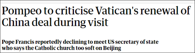 蓬佩奧本週開啓了對希臘、意大利、梵蒂岡和克羅地亞等歐洲4國的訪問,預計在當地時間9月29日到訪梵蒂岡。《衞報》報道稱,蓬佩奧此行預計會就中梵主教任命臨時協議的續約問題,向羅馬教廷施壓。他早前曾大肆渲染説,若梵蒂岡與中國續簽協議會“危及天主教會的道德權威”。