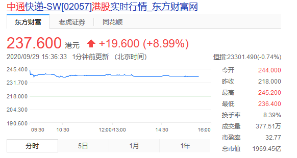 上市首日,中通港股高開11.93%,報244港元,市值超2000億港元。截止發稿,股價為237.6港元,較發售價漲8.99%。