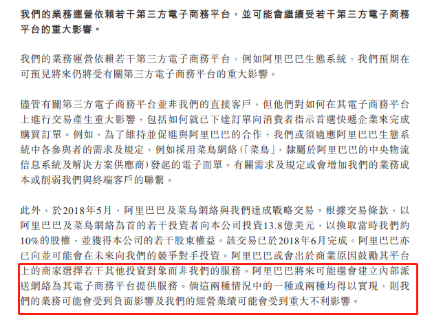 對於阿里持股,中通在招股書中的風險因素中表示,中通業務運營依賴若干第三方電子商務平台,例如阿里巴巴生態系統,它們對如何在其電子商務平台上進行交易產生重大影響。為了維持並促進與阿里的合作,中通必須使用阿里生態系統中各參與者的需求及規定,例如採用菜鳥網絡發起的電子面單,而這類需求及規定可能增加中通的業務成本,並削弱其與終端用户的聯繫。