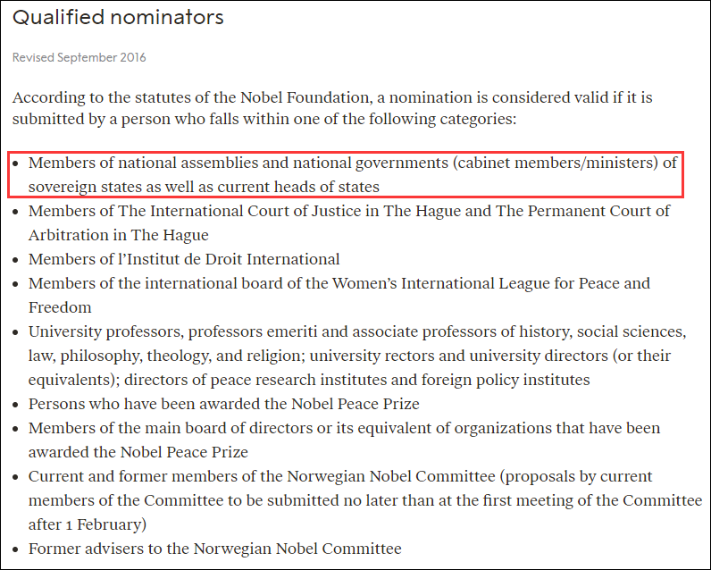 此外,包括海牙國際法庭成員、大學校長、歷史學、社會科學、法律、哲學、神學和宗教的大學教授、名譽教授和副教授以及往屆該獎項獲獎者等人士,均可提名諾貝爾和平獎獲獎候選人。
