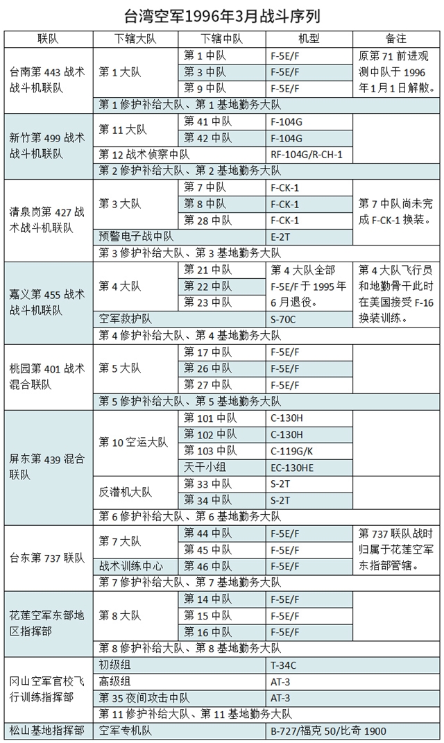 在1996年3月為高峯時期的台海導彈危機中,台空軍飛行部隊無疑是兩岸對峙的第一線部隊。在這一時期,主管全部飛行部隊台空軍作戰司令部總計擁有7個聯隊,1個地區指揮部,9個大隊,16支戰鬥機中隊,3支空運中隊,5支獨立中隊的實力。