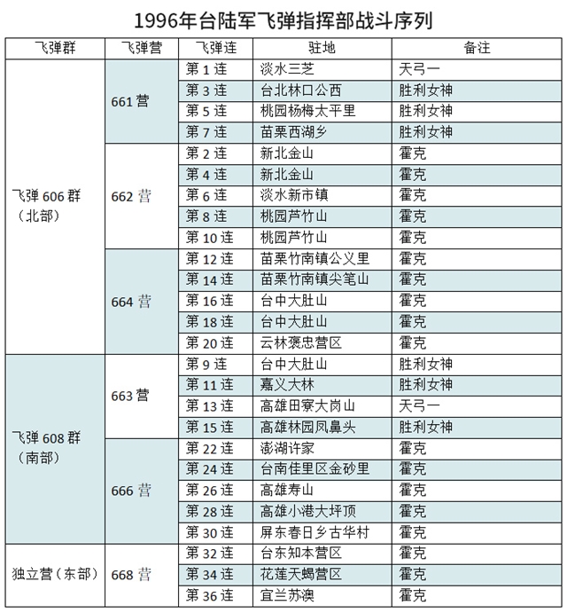 在1996年3月時,台陸軍飛彈指揮部唯一堪用的遠程防空導彈部隊只有淡水和大崗山的兩個尚未完成全部測試項目之“天弓一”導彈連,第3個完工的“天弓一”導彈陣地位於孤懸於外海的東引島,竣工時間為危機緩解後的當年8月。相對於不成熟的“天弓一”系統,年邁的“勝利女神”導彈則更是爛泥扶不上牆——在此前的兩次試射中,該型導彈全都以脱靶的形式交了白卷。