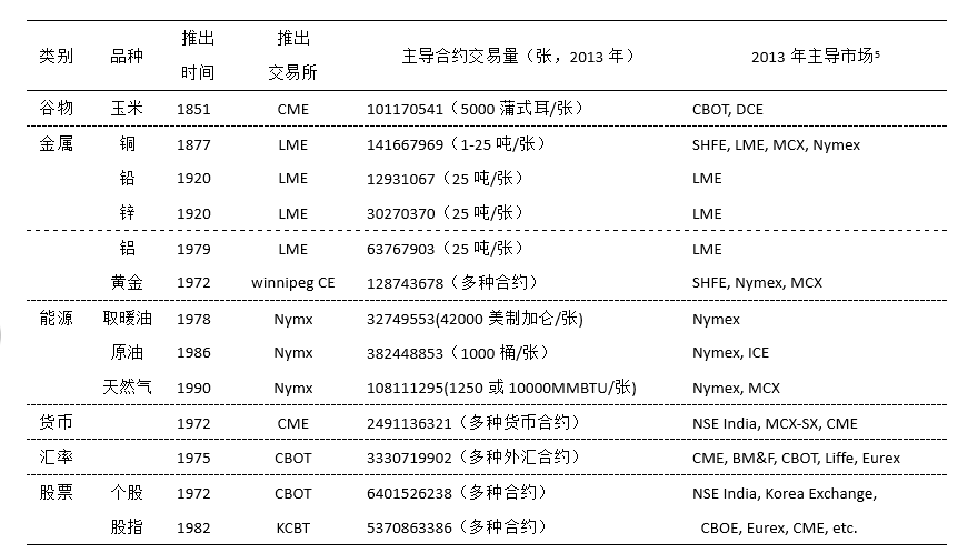 [5] 表中提到的交易所分別為:Nymex,紐約商品交易所;CBOT,芝加哥期貨交易所;CBOE芝加哥期權交易所;CME,芝加哥商品交易所;LME,倫敦金屬交易所;ICE,倫敦洲際交易所;Liffe,倫敦國際金融期貨交易所;Eurex,歐洲期貨交易所;SHFE,上海期貨交易所;DCE,大連期貨交易所;NSA India,印度國家證券交易所;MCX,印度商品交易所;MCX-SX,印度股票交易所;BM&F,巴西商品與期貨交易所;Korea Exchange,韓國證券期貨交易所。