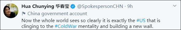 之後華春瑩又反擊説,如今全世界已清楚地看到,美國正在用新冷戰思維建立一堵新牆。