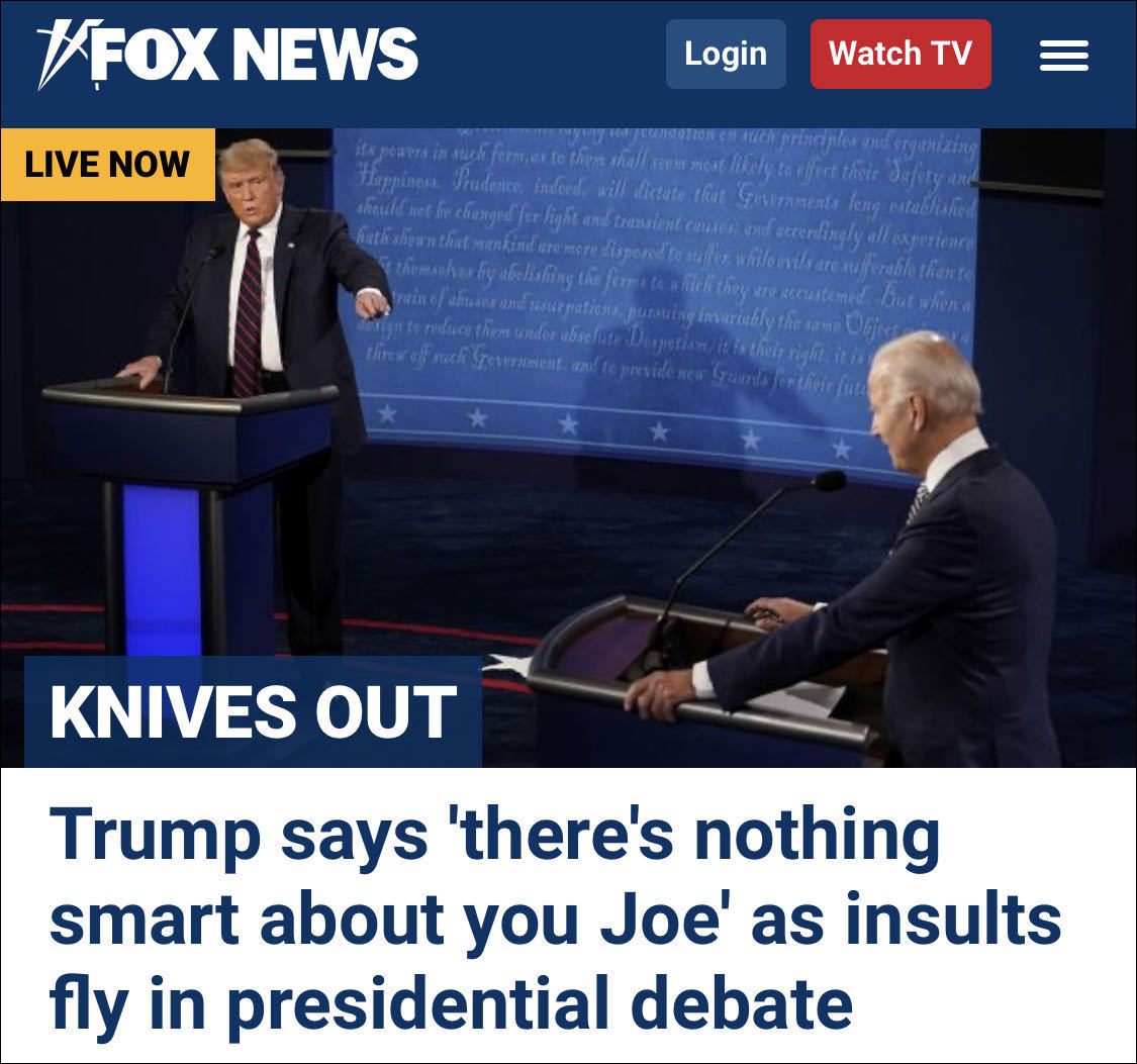 特朗普相對喜歡的福克斯新聞也看出來了,説“總統辯論中到處都是侮辱性言論”,比如特朗普説“你一點都不聰明,喬。”