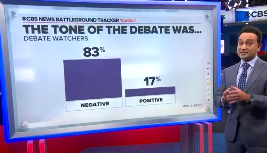 對於此場辯論的基調,83%的觀眾認為是負面的,17%的觀眾認為是正面的。