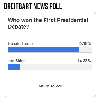 然而,美國右翼網絡媒體布賴特巴特新聞網的民調結果卻截然不同,網站顯示有85.18%的觀眾認為是特朗普贏了首場辯論,只有14.82%的觀眾認可拜登。