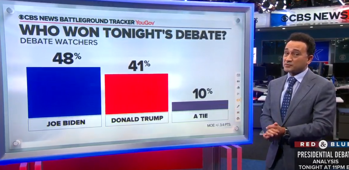對於“誰贏了今晚的辯論”,48%的觀眾認為是拜登贏了,41%認為是特朗普贏了,10%認為是平局。