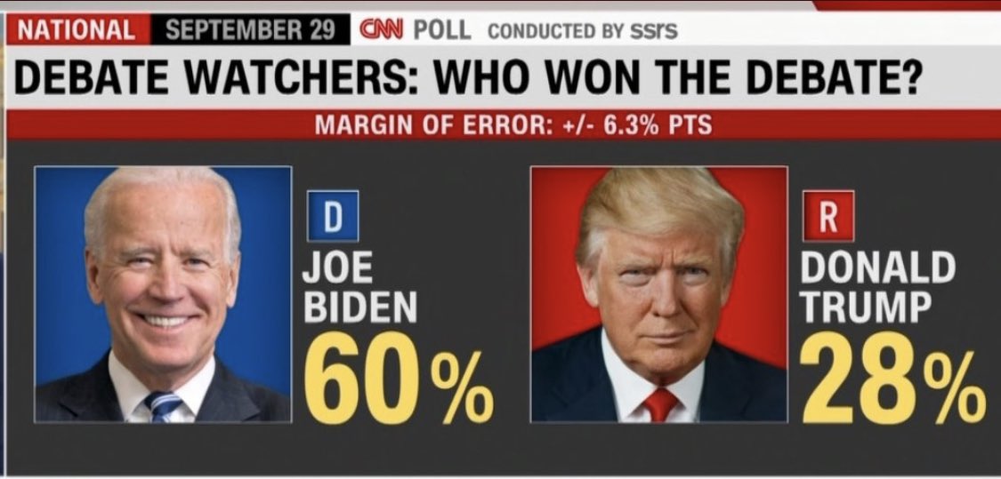 另據美國有線電視新聞網CNN的民調數據顯示,在首場辯論結束後,60%的觀眾認為拜登贏了辯論,只有28%的觀眾認為特朗普表現得更好。