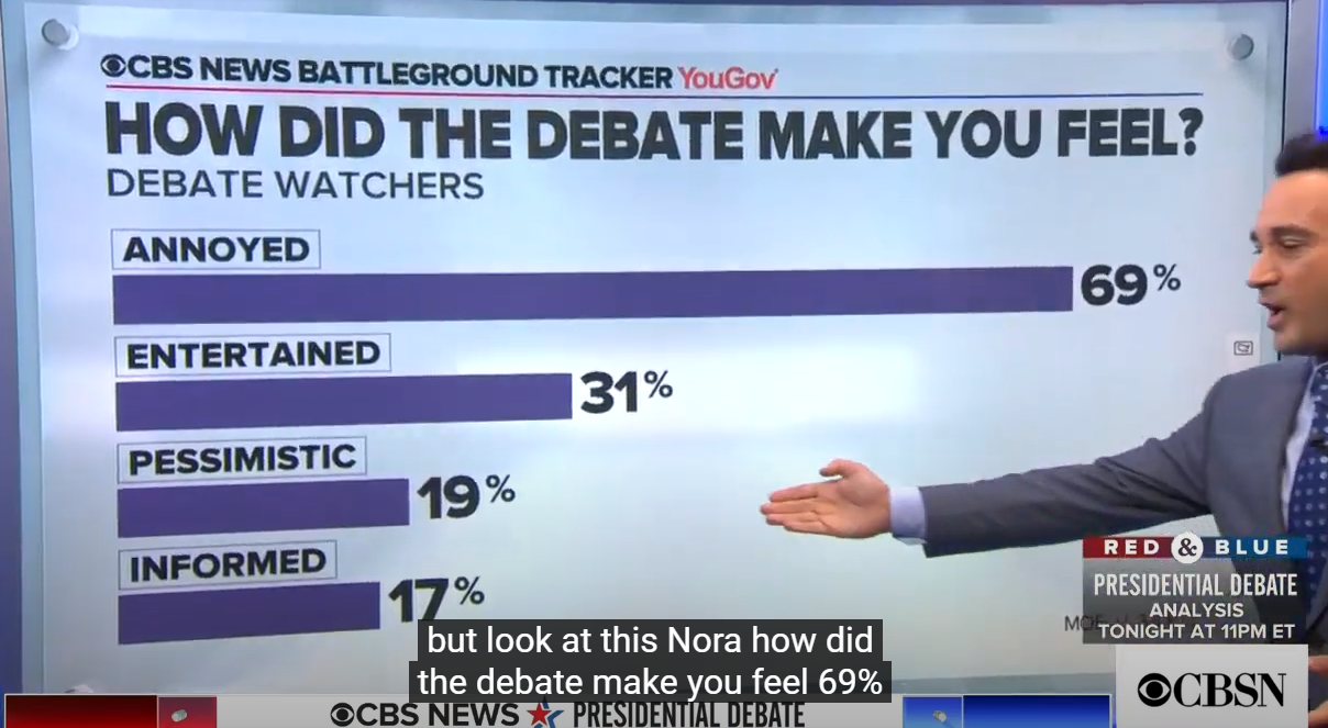 對於“這場辯論讓你感覺如何”,31%認為“令人愉快”,19%的觀眾認為“令人悲觀”,17%的觀眾認為“言之有物”。