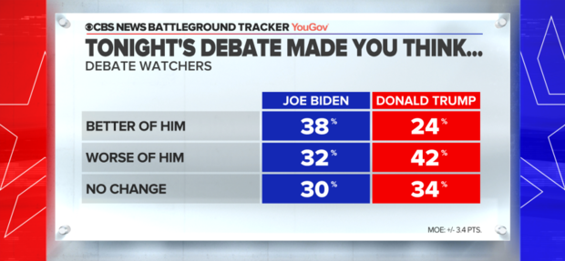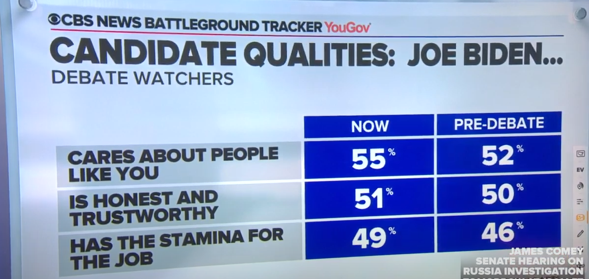 在關於“候選者的品質”調查中,辯論結束後,46%的觀眾認為特朗普“關心”他們,而55%的觀眾則認為拜登更在乎他們。