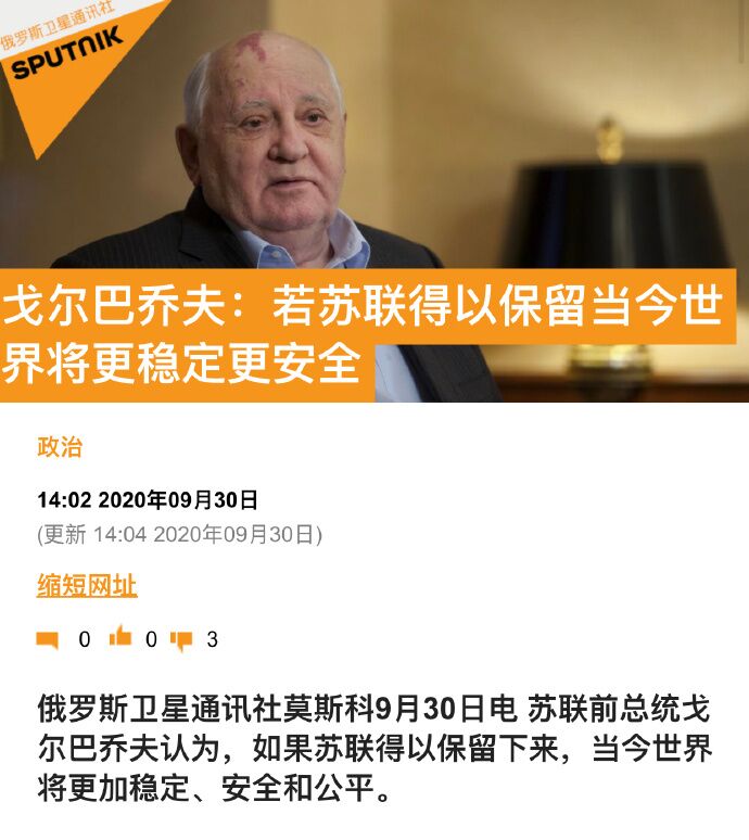 9月29日,90歲的戈爾巴喬夫在接受採訪時表示,如果蘇聯還存在,那麼世界會更穩定安全。
