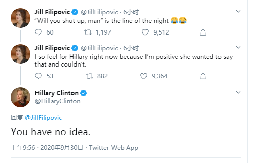 (觀察者網訊)當地時間9月29日21時,美國2020大選迎來首場總統辯論,在超過90分鐘的辯論中,美國總統特朗普73次打斷他人説話,以至於被美國前副總統、民主黨總統候選人拜登怒斥“你能閉嘴嗎!夥計”。而整場辯論下來,網友們也因此開始回想、同情起4年前與特朗普同樣展開辯論的時任民主黨總統候選人希拉里,希拉里本人則對此回應承認,她當初也超想這麼説。