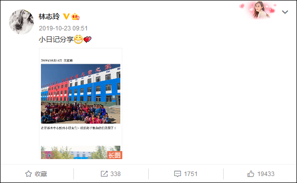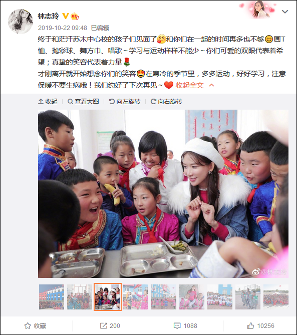 時隔一天後的10月23日,林志玲又在微博上,以長微博的形式發佈了一則“小日記”,記錄和分享了在內蒙古和孩子們見面的感受。