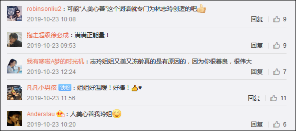 在林志玲的這兩條微博下方,許多大陸網友紛紛留言給她點贊,稱其“人美心善”、“滿滿正能量”、“好温暖”等等。