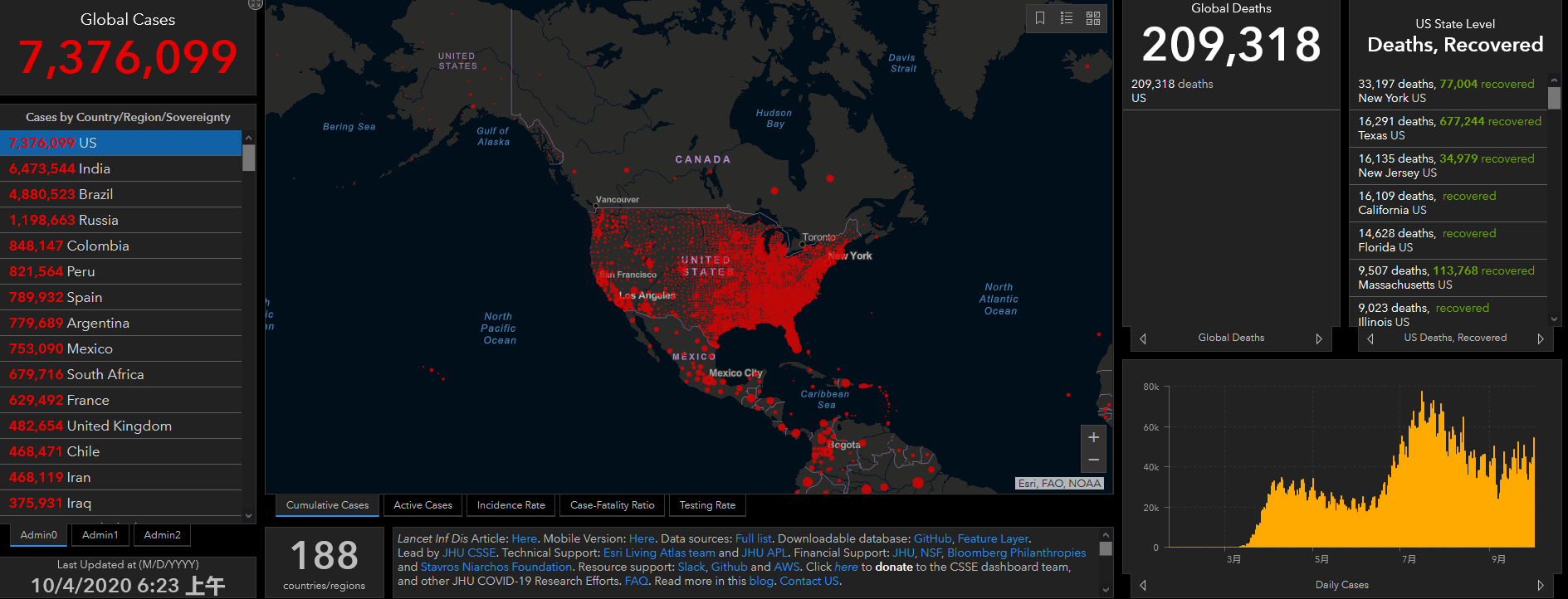 (觀察者網訊)根據美國約翰斯·霍普金斯大學實時數據,截至北京時間10月4日6時23分(美東時間10月3日18時23分),美國累計新冠確診病例達到7376099例,累計死亡達209318例,過去24小時,新增確診病例50384例,新增死亡病例718例。