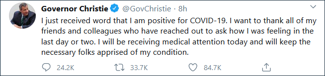 當地時間3日,克里斯蒂在推特上表示自己“剛剛收到新冠檢測呈陽性的報告”,他對朋友和同事的關心表達了感謝,表示將在當天接受治療。就在此前一天,克里斯蒂還曾發推表示,自己在本週二(29日)的病毒檢測呈陰性,身體很健康,沒有任何症狀。