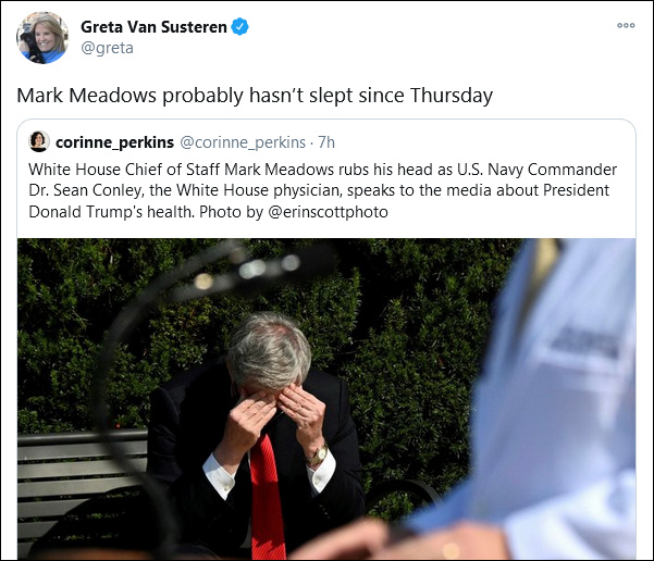 新聞節目Full Court Press主持人蘇斯特倫(Greta Van Susteren)直言:“馬克·梅多斯可能從週四起就沒睡過覺了。”