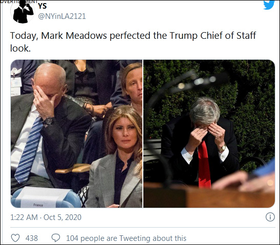 有網民貼出白宮前幕僚長約翰·凱利(John Kelly)的扶額照,戲稱道:“馬克·梅多斯完善了特朗普幕僚長的形象。”
