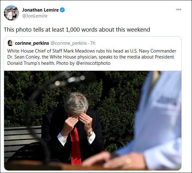 當地時間10月4日上午,特朗普醫療團隊舉行記者會通報病情,坐在一旁的梅多斯低頭雙手扶額,看起來壓力巨大。這一幕被路透社攝影師艾琳·斯科特(Erin Scott)拍下。