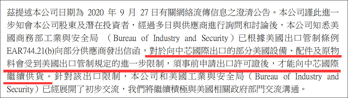 值得一提的是,儘管多次澄清和中國軍方毫無關係,也沒有為任何軍用終端用户生產,中芯國際還是於昨晚(10月4日)證實,供應商向其出口的部分美國設備、配件及原物料會受到美國出口管制規定的進一步限制,須事前申請出口許可證後,才能向該公司繼續供貨。