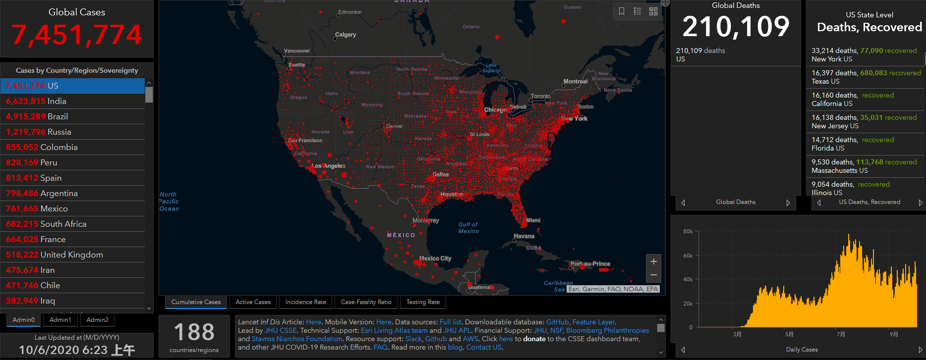 (觀察者網訊)根據美國約翰斯·霍普金斯大學實時數據,截至北京時間10月6日6時23分(美東時間10月5日18時23分),美國累計新冠確診病例達到7451774例,累計死亡達210109例。過去24小時,美國新增確診病例33902例,新增死亡病例307例。