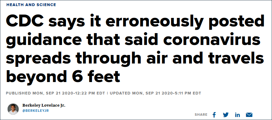 9月CNBC報道:美疾控中心稱錯誤地發佈病毒通過空氣傳播德信息