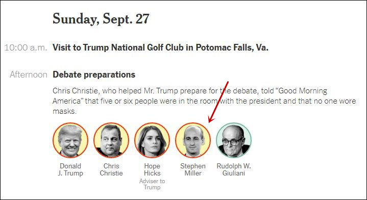 截止目前,特朗普近期接觸過的已確診人員(紅框內為斯蒂芬·米勒)圖源:紐約時報