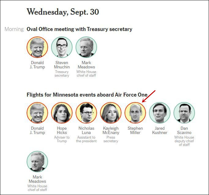 30日,他又陪同特朗普乘坐空軍一號前往明尼蘇達州參加活動,這是《紐約時報》統計的米勒最近一次待在特朗普身邊。