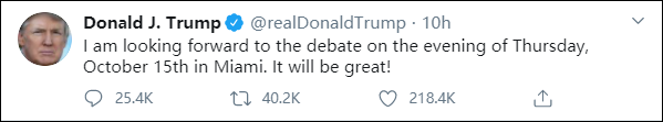 同日,特朗普在推特上喊話稱,“期待15日晚在邁阿密舉行的辯論。”並表示這場辯論將會很棒。
