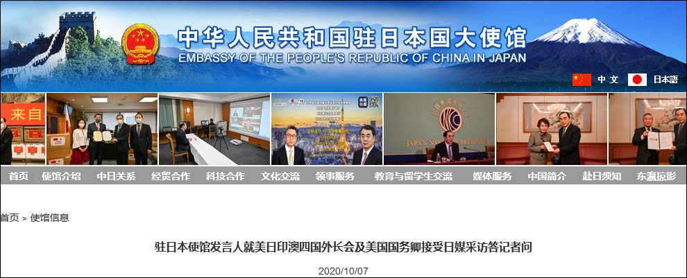 中國駐日本大使館網站10月7日發佈《駐日本使館發言人就美日印澳四國外長會及美國國務卿接受日媒採訪答記者問》,以下為文章全文: