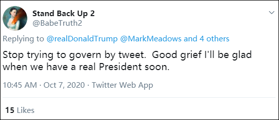 10月6日下午3時左右,推特上喊話“南希”稱,她談判根本沒誠意,“我拒絕了他們(民主黨議員)的請求。”“我已要求代表停止與他們的談判,**直到大選後、我順利當選:**屆時我將為勤勞的美國人民和小企業再準備一份大的刺激法案。”特朗普稱。