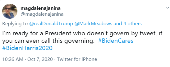 10月5日,特朗普突然瘋狂發推,一小時發佈18條內容,大多十分簡短,全部使用大寫字母來強調;其中15條,特朗普都配上了一句“投票!”(VOTE!)。