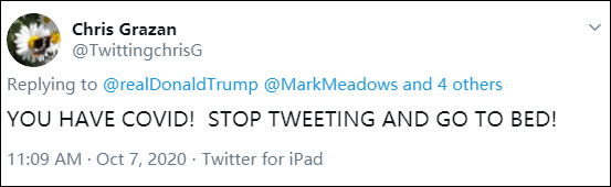 雖説一天62條還沒有打破特朗普個人單日發推記錄,但他目前已患新冠肺炎,且剛被發現有“呼吸困難”的狀況,因此有網友在他的某推文下評論用大寫字母喊道“你都得新冠了,快別發了,上牀睡覺吧!”