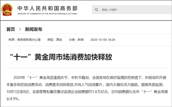 商務部:“十一”黃金週全國零售和餐飲企業銷售額1.6萬億
